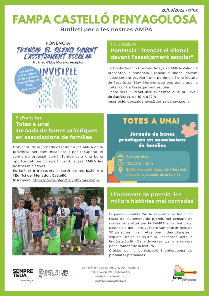 En el butlletí d’aquesta setmana us informem sobre una ponència de l’escriptor Eloy Moreno, la primera jornada de bones pràctiques en associacions de famílies “Totes a una! i sobre l’acte de lliurament de premis del concurs de contes de la FAMPA que es va dur a terme el passat dissabte.