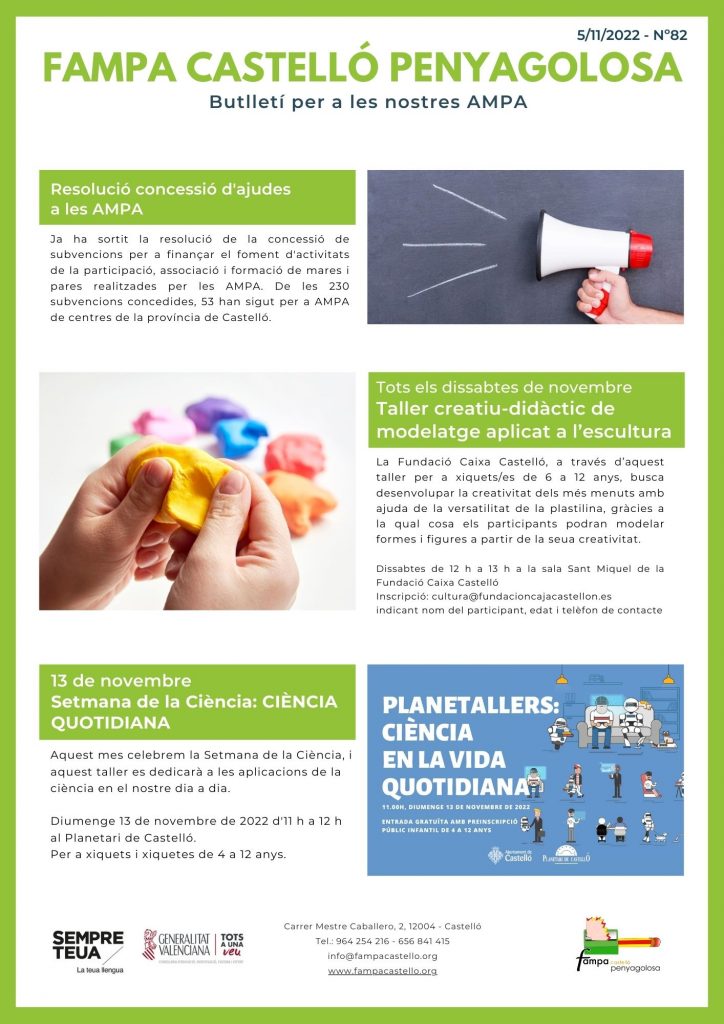 En el butlletí d’aquesta setmana us informem sobre la resolució de la concessió de subvencions per a finançar el foment d’activitats de la participació, associació i formació de mares i pares realitzades per les AMPA, un taller creatiu-didàctic de modelatge aplicat a l’escultura i, finalment, sobre una activitat per a celebrar la setmana de la ciència anomenada Ciència Quotidiana.