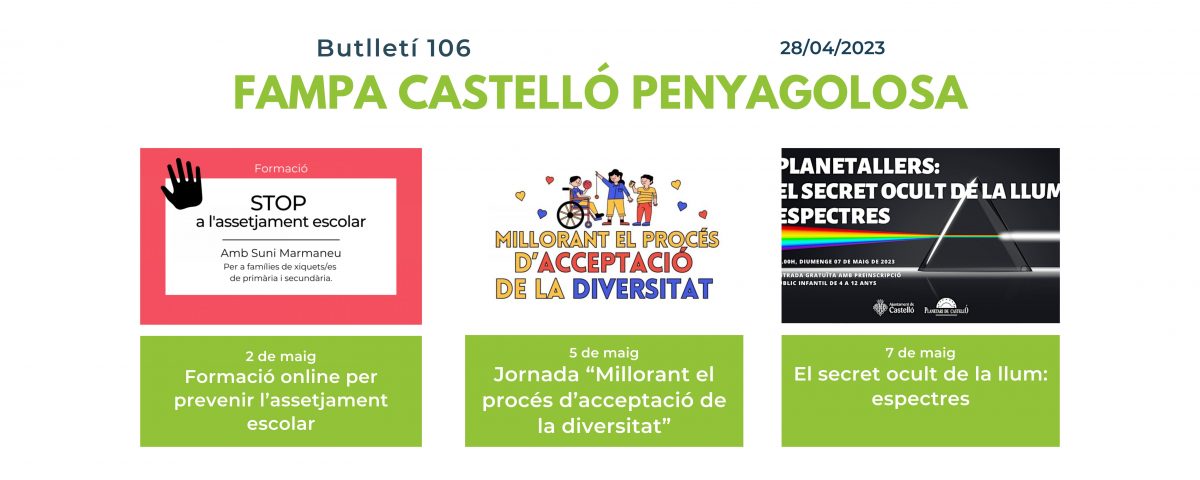 En el butlletí d’aquesta setmana portem tres interessants activitats: la primera es tracta d’una formació organitzada per la federació i titulada “Stop a l’assetjament escolar”, aquesta es realitzarà el dia 2 de maig, per a celebrar el Dia Internacional Contra l’Assetjament Escolar.