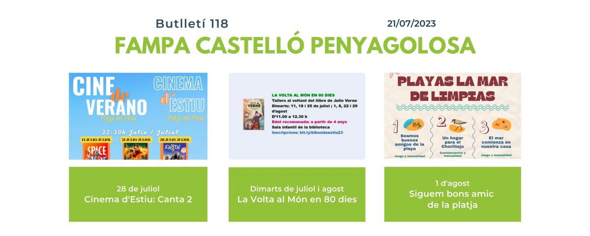 - La tercera i última activitat s’anomena “Siguem Bons Amics de la Platja” i es durà a terme el dia 1 d’agost a partir de les 18 h (encara que es farà un passe cada 30 min fins a les 20 h) a Platja del Serradal de Castelló. Consistirà en un taller de jocs i treballs manuals relacionats amb el medi ambient.