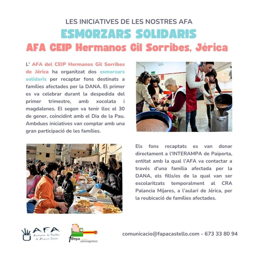 L’AMPA del CEIP Hermanos Gil Sorribes de Jérica ha organitzat dos esmorzars solidaris per recaptar fons destinats a famílies afectades per la DANA. El primer es va celebrar durant la despedida del primer trimestre, amb xocolata i magdalenes. El segon va tenir lloc el 30 de gener, coincidint amb el Dia de la Pau. Ambdues iniciatives van comptar amb una gran participació de les famílies.