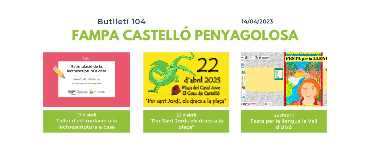 En el boletín de esta semana os presentamos nuestro taller en línea de Estimulación de la Lectoescritura en Casa que impartirá nuestra formadora y lingüista Judith Gallardo; además, os hablamos también de algunas actividades que se realizarán en el Grao de Castelló con motivo de la fiesta de Sant Jordi; para finalizar os presentamos la Fiesta por la Lengua que tendrá lugar el 23 de abril en la Vall d’Uixó.