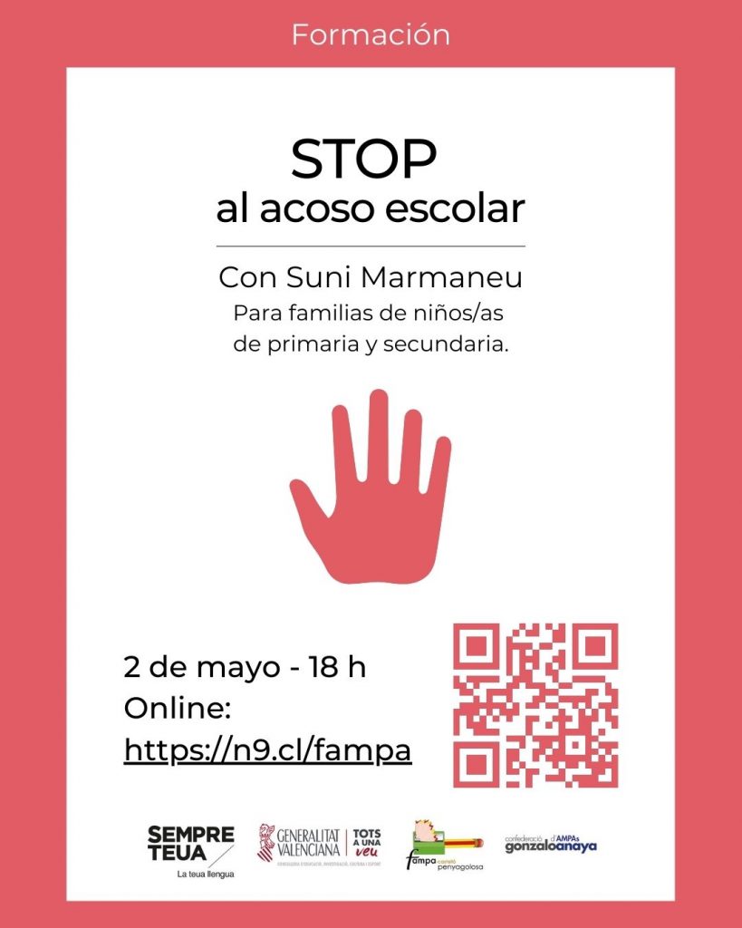 El martes 2 de mayo, Día Internacional Contra el Acoso Escolar, la FAMPA Castelló Penyagolosa, junto con la formadora y psicóloga Suni Marmaneu, ofrece una formación titulada «Stop al Acoso Escolar» de 18 h a 19 h.