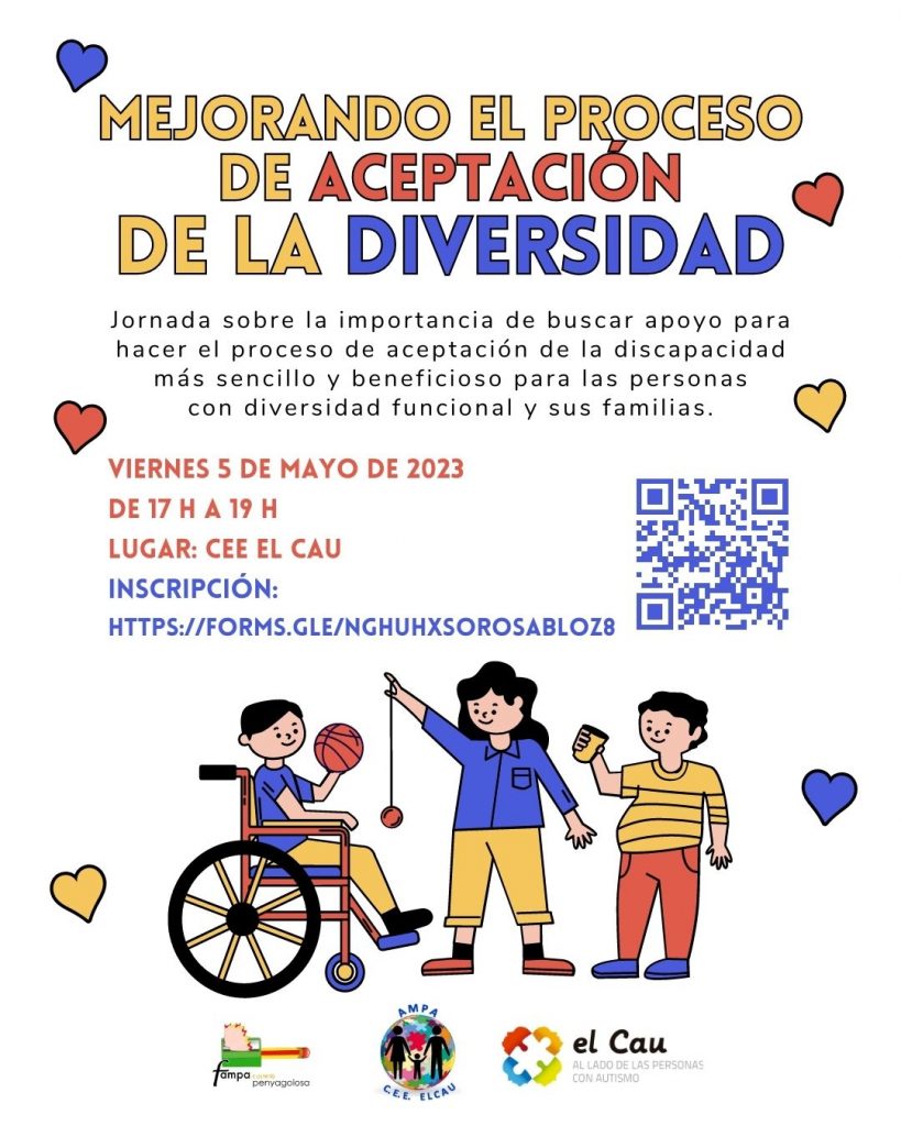 El día 5 de mayo la FAMPA Castelló Penyagolosa, junto con la AMPA del Colegio de Educación Especial (CEE) el CAU, presenta una jornada sobre la importancia de buscar apoyo para hacer el proceso de aceptación de la discapacidad más sencillo y beneficioso para las personas con diversidad funcional y sus familias. La formación empezará a las 17 h y se realizará en el mismo centro.