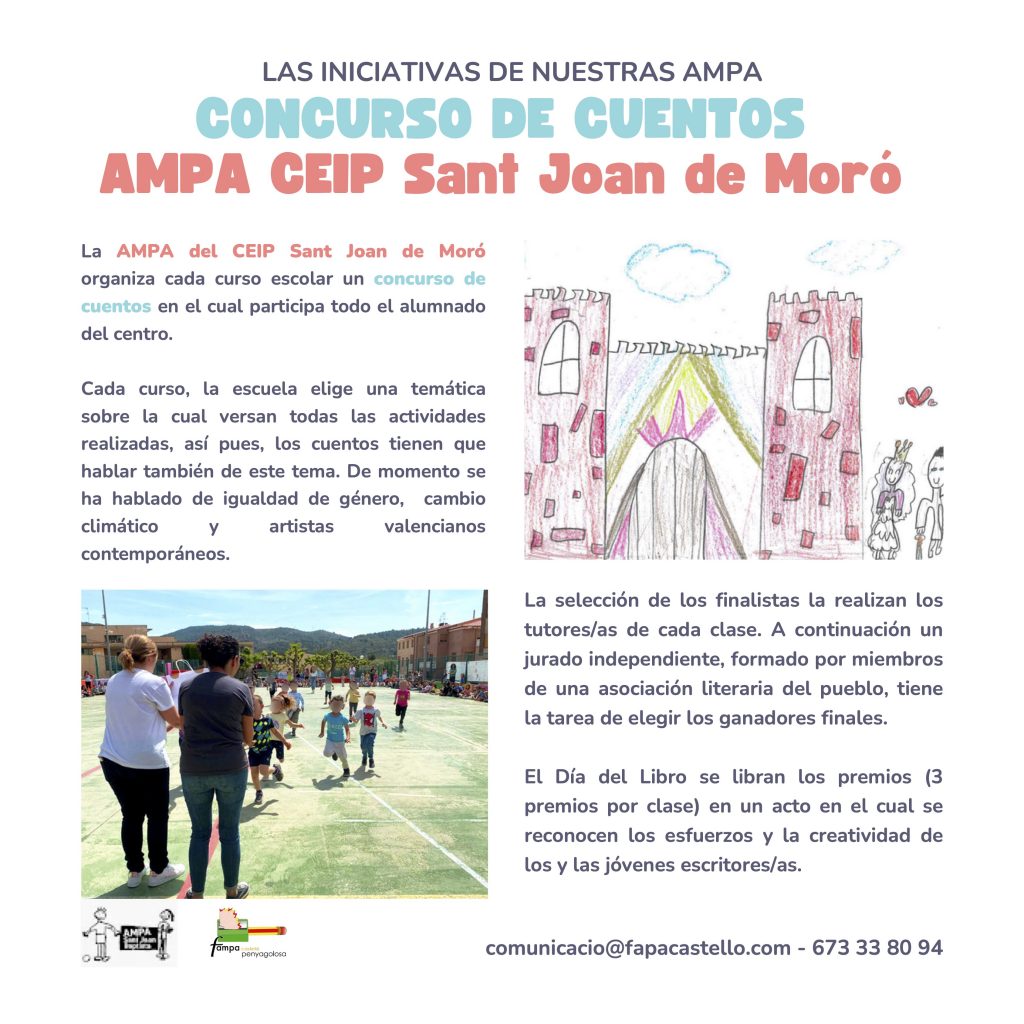 La AMPA del CEIP Sant Joan de Moró con la colaboración del centro, ha estado organizando con éxito un concurso literario durante los últimos tres cursos escolares. Se trata de una actividad que ha conseguido involucrar a todos los alumnos de la escuela. Cada curso la escuela elige una temática sobre la cual versan todas las actividades realizadas, así pues, los cuentos tienen que hablar también de este tema. Hasta ahora los temas han sido la igualdad de género, el cambio climático y artistas valencianos contemporáneos.