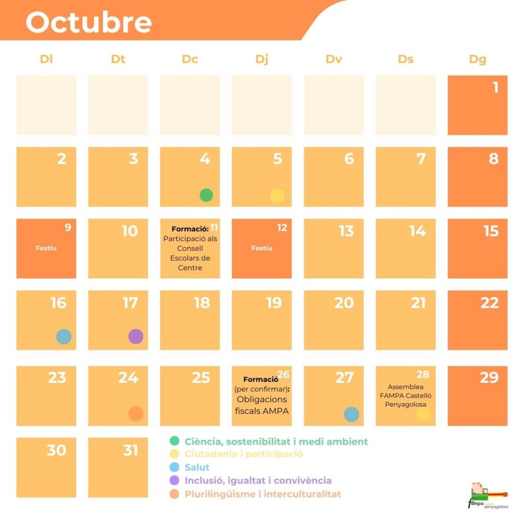 A partir de ahora, cada mes publicaremos un calendario como este con los días festivos, los días conmemorativos más destacados en el ámbito de la inclusión, la cultura, la ciencia o el medio ambiente y también con nuestras actividades (tanto de la FAMPA Castelló Penyagolosa como de la Confederación Gonzalo Anaya).