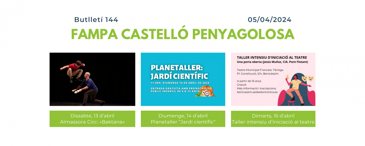 Ya está aquí el boletín de la FAMPA Castelló Penyagolosa. En este, os presentamos, una semana más, tres actividades familiares gratuitas que tendrán lugar en las localidades de nuestra provincia en los próximos días.
