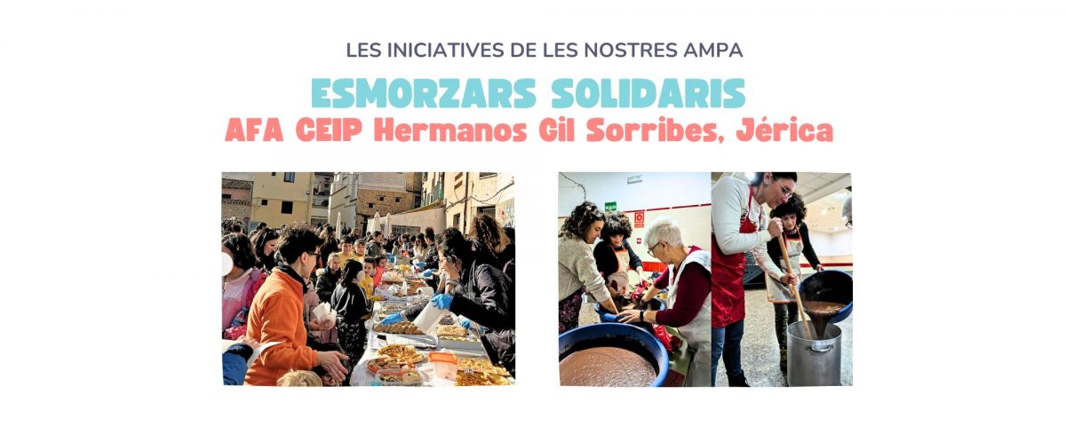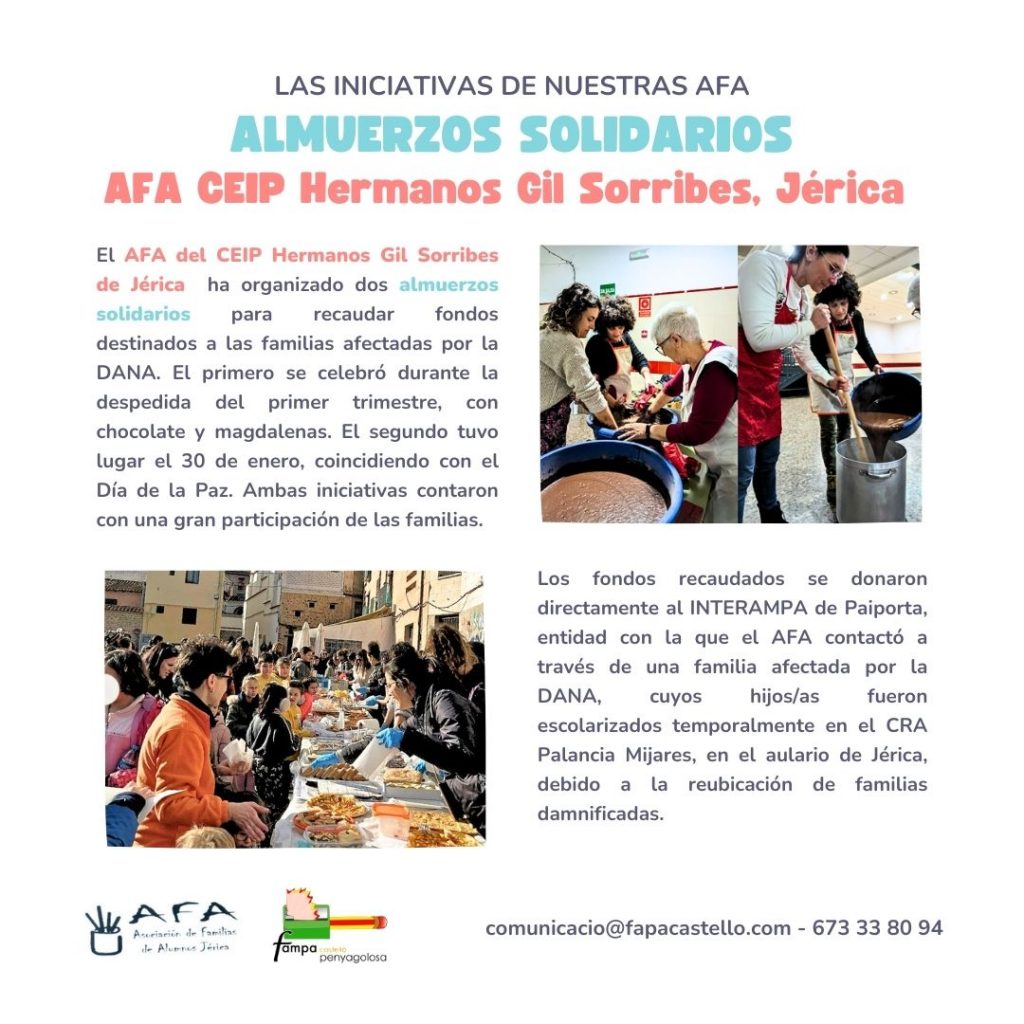 AFA del CEIP Hermanos Gil Sorribes de Jérica ha organizado dos almuerzos solidarios para recaudar fondos destinados a las familias afectadas por la DANA. El primero se celebró durante la despedida del primer trimestre, con chocolate y magdalenas. El segundo tuvo lugar el 30 de enero, coincidiendo con el Día de la Paz. Ambas iniciativas contaron con una gran participación de las familias.