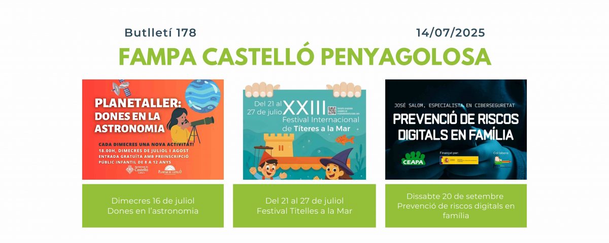 Compartimos con vosotras y vosotros el boletín n.º 178 de la FAMPA Castelló Penyagolosa, con una selección de actividades para disfrutar en familia. Estas propuestas están pensadas para ofrecer opciones de ocio educativo, cultural y lúdico para niñas, niños y sus familias en todo el territorio.