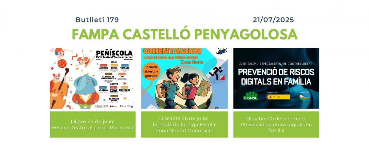 Compartimos con vosotras y vosotros el boletín n.º 178 de la FAMPA Castelló Penyagolosa, con una selección de actividades para disfrutar en familia. Estas propuestas están pensadas para ofrecer opciones de ocio educativo, cultural y lúdico para niñas, niños y sus familias en todo el territorio.