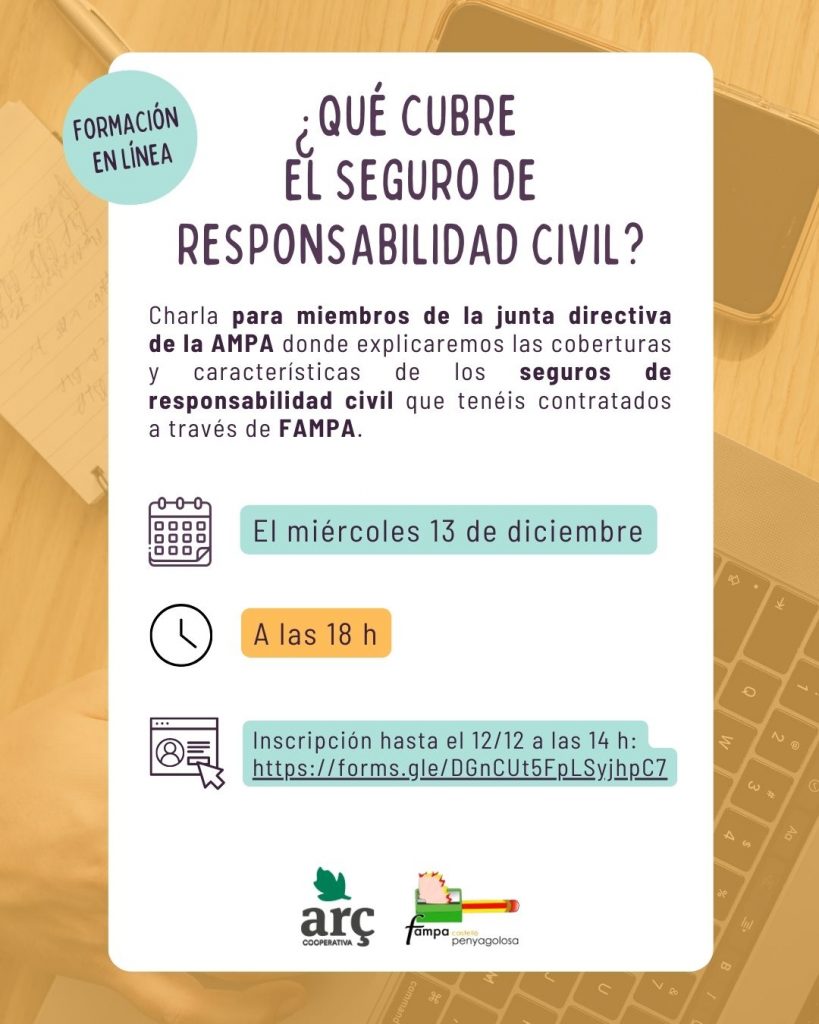 os queremos invitar a la formación “¿Qué cubre el seguro de responsabilidad civil?”, organizada con la colaboración de Arç, que tendrá lugar el miércoles 13 de diciembre a las 18 h en línea.