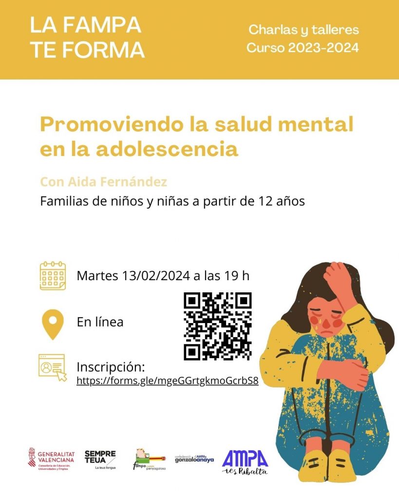 El martes 13 de febrero a las 19 h la AMPA IES Ribalta ha organizado, en colaboración con FAMPA Castelló Penyagolosa, el taller en línea “Promoviendo la salud mental en la adolescencia” que impartirá Aida Fernández (https://aidafernandezpsicologa.com), licenciada en psicología clínica con más de 15 años de experiencia.