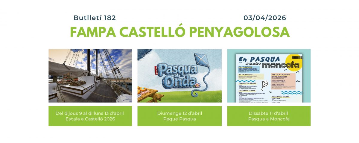 Compartim amb vosaltres una nova edició del butlletí de la FAMPA Castelló Penyagolosa. Hi trobareu una selecció d’activitats gratuïtes per a gaudir en família. L’objectiu és acostar-vos opcions d’oci educatiu, cultural i lúdic per a xiquets, xiquetes i joves a diferents comarques de la província, per tal que pugueu passar temps de qualitat junts sense necessitat de fer grans desplaçaments.
