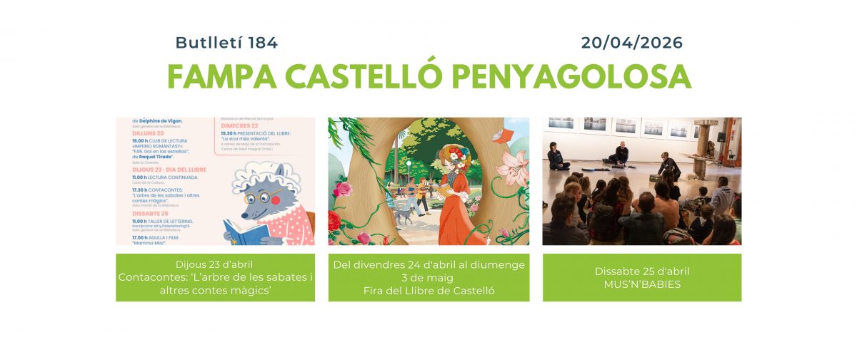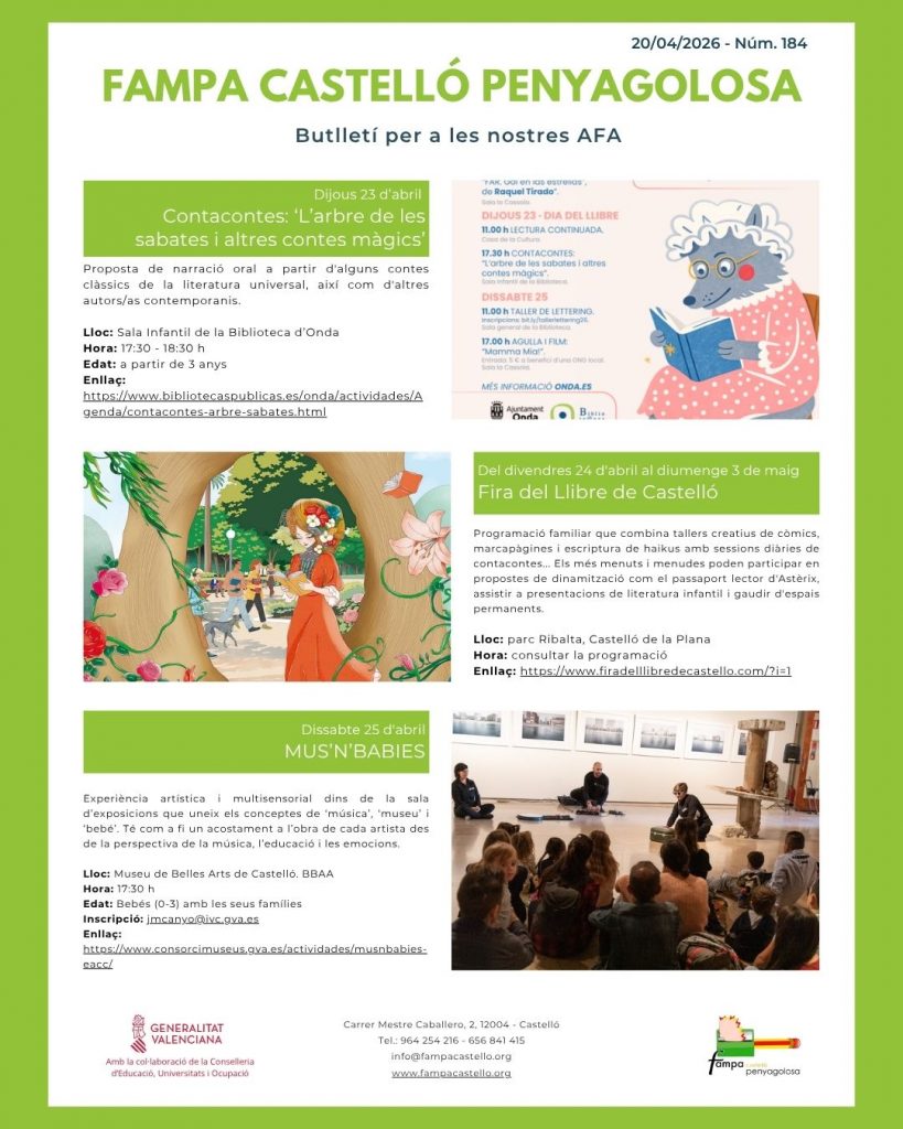 Compartim amb vosaltres una nova edició del butlletí de la FAMPA Castelló Penyagolosa. Hi trobareu una selecció d’activitats gratuïtes per a gaudir en família. L’objectiu és acostar-vos opcions d’oci educatiu, cultural i lúdic per a xiquets, xiquetes i joves a diferents comarques de la província, per tal que pugueu passar temps de qualitat junts sense necessitat de fer grans desplaçaments.