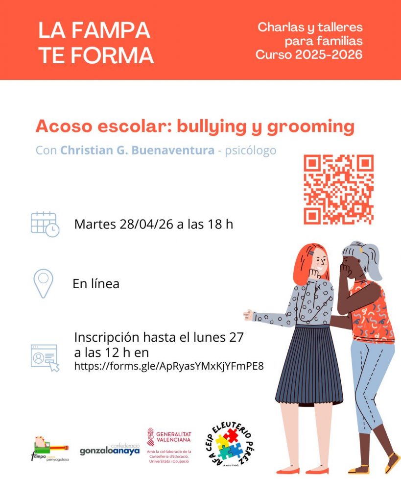 Se trata de una formación pensada para dar herramientas a las familias que les permitan reforzar la confianza con sus hijos e hijas y ejercer un papel activo en la prevención, desde la escucha, la cercanía y el acompañamiento.Inscripción hasta el lunes 27 a las 12 h: https://forms.gle/ApRyasYMxKjYFmPE8