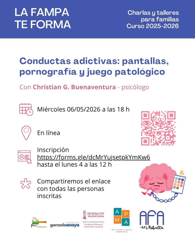 Son sesiones que nos han solicitado diversas AFA federadas, ya que responden a preocupaciones reales que tienen muchas familias hoy en día, como el uso de las pantallas, la seguridad en internet, el acoso escolar, el bienestar emocional en la adolescencia o cómo ayudarles a organizarse mejor con los estudios.